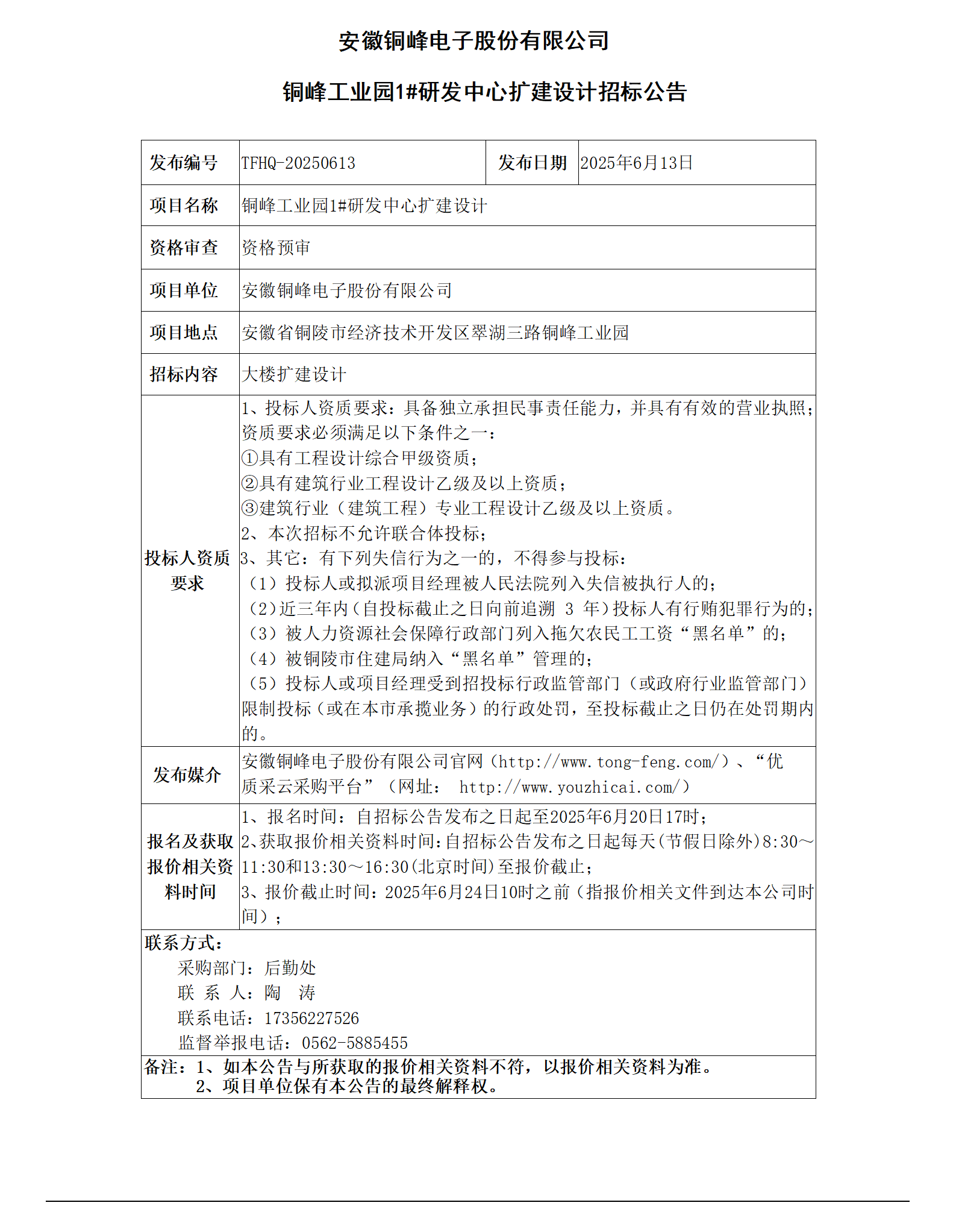 安徽銅峰電子股份有限公司 (銅峰工業(yè)園1#研發(fā)中心擴(kuò)建設(shè)計(jì)招標(biāo)公告)_01