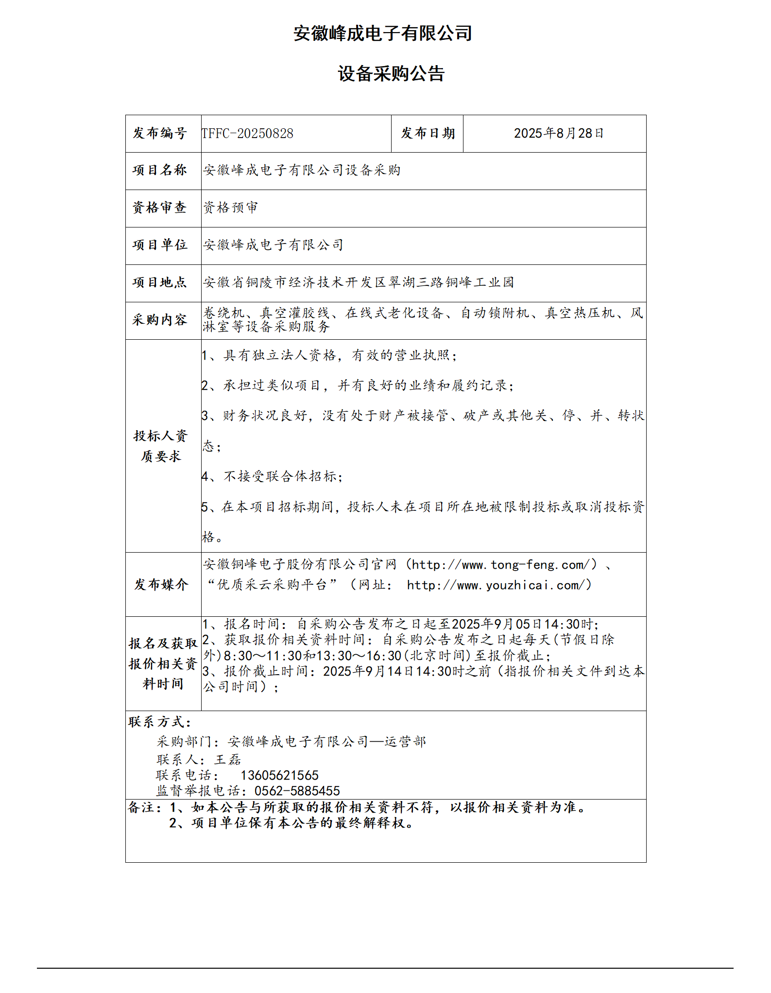 安徽峰成電子有限公司設備采購公告_01